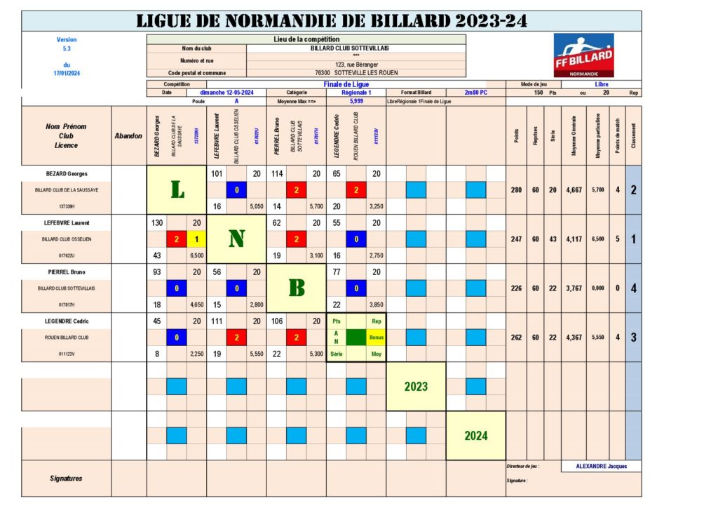 Les 3 autres joueurs ont gagnés 2 matchs chacun. Laurent Lefebvre grâce à son point de bonus finit 1er. Il est donc champion de Normandie.
