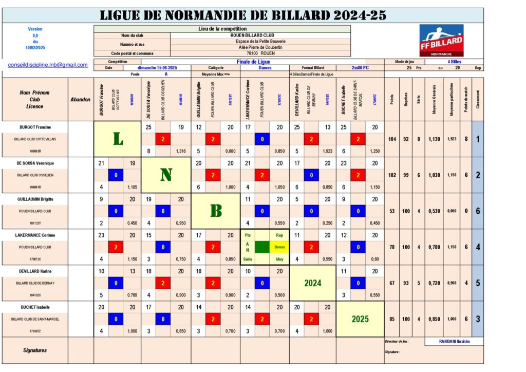 La Finale départementale de 4 Billes Féminines s’est déroulée le 15 Juin 2025 à Rouen dans une finale à 6 joueurs. Francine Burgot représentait le BCS.