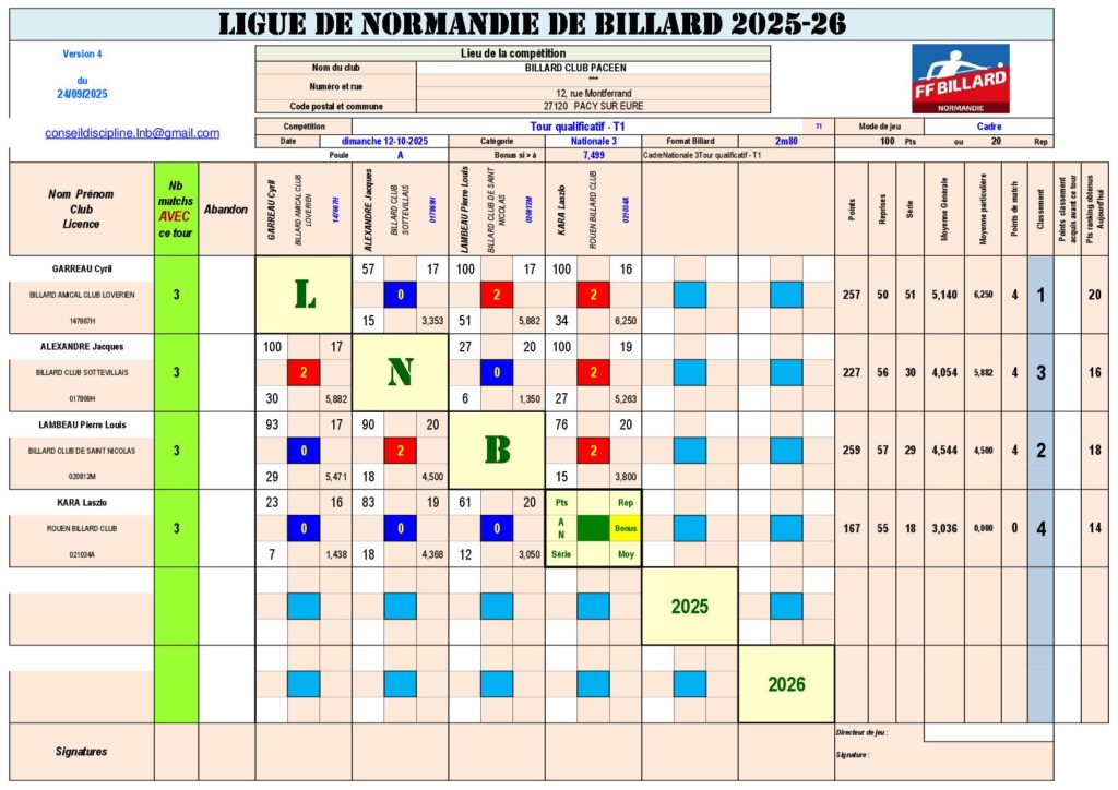 Le premier tour du cadre 42/2 N3 s’est déroulé le dimanche 12 octobre à Pacy-sur-Eure, avec deux poules de 4 joueurs.