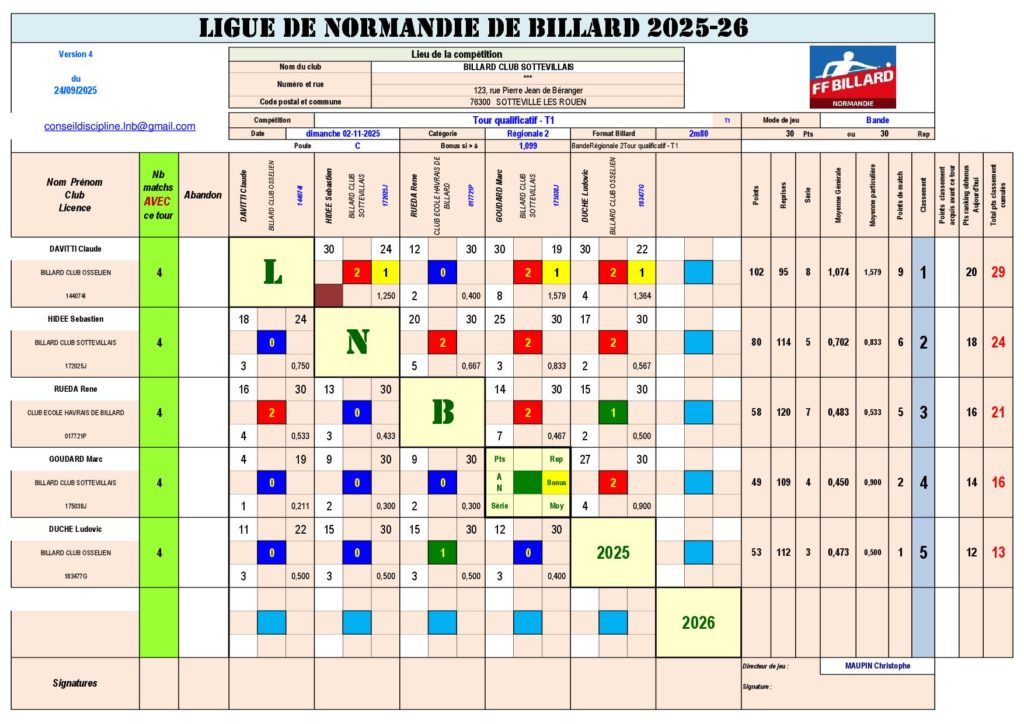 Le premier tour de Bande Régionale 2 s’est déroulé le 2 novembre 2025, avec les joueurs répartis en trois poules.