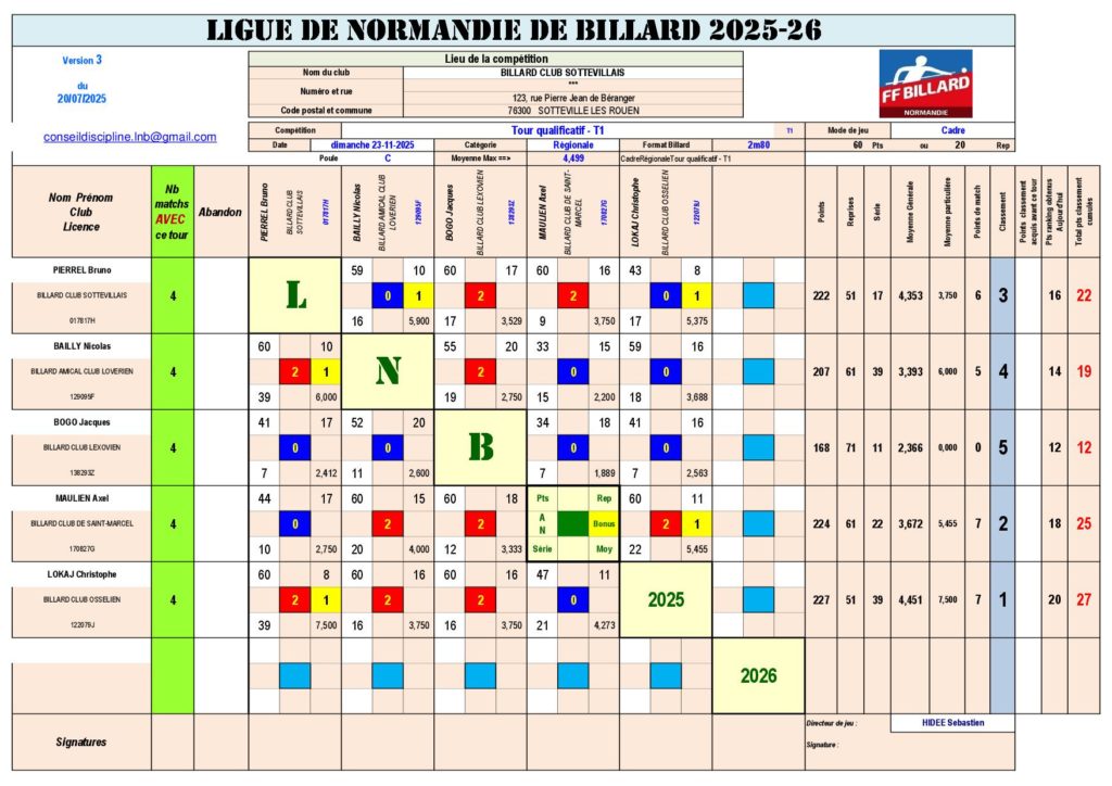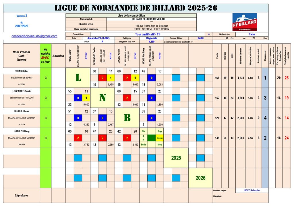 Le 1er tour du Cadre Régional s’est déroulé le 23 novembre 2025, répartissant les joueurs en trois poules :